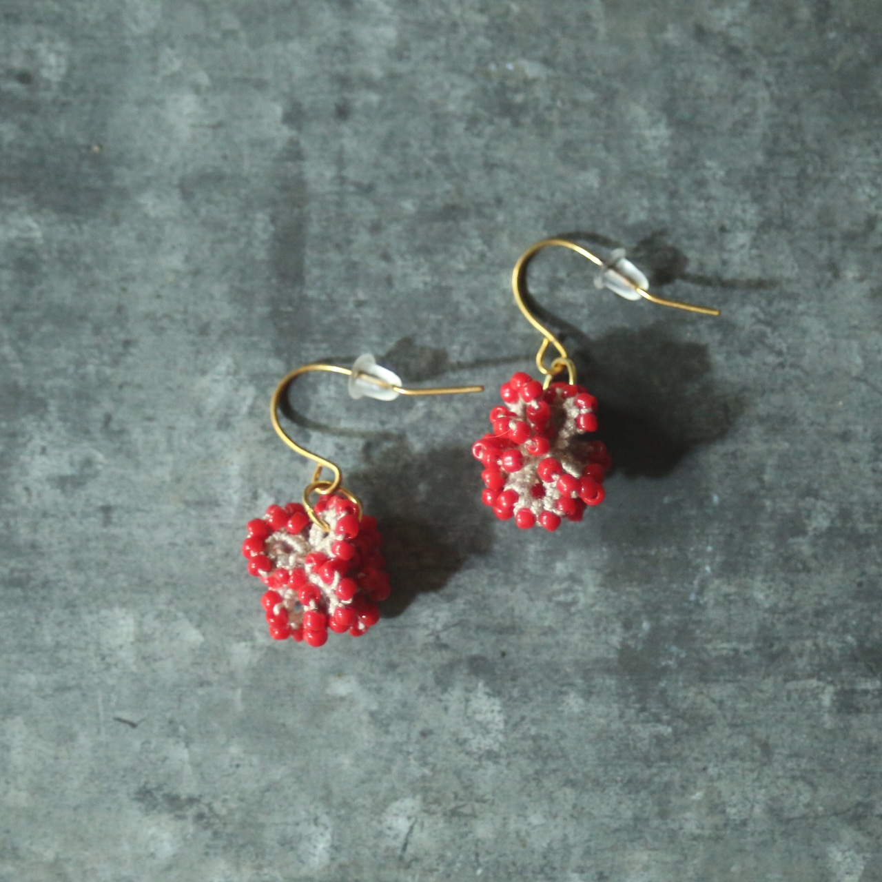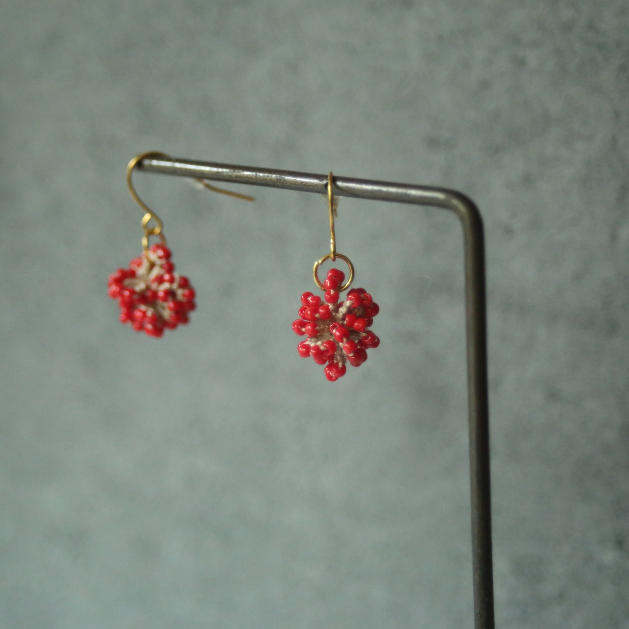 こちらはビーズタティングレースの手法により、極小シードビーズを一つずつ編み込んだ、コロンとしたフォルムが可愛らしいアクセサリーです。