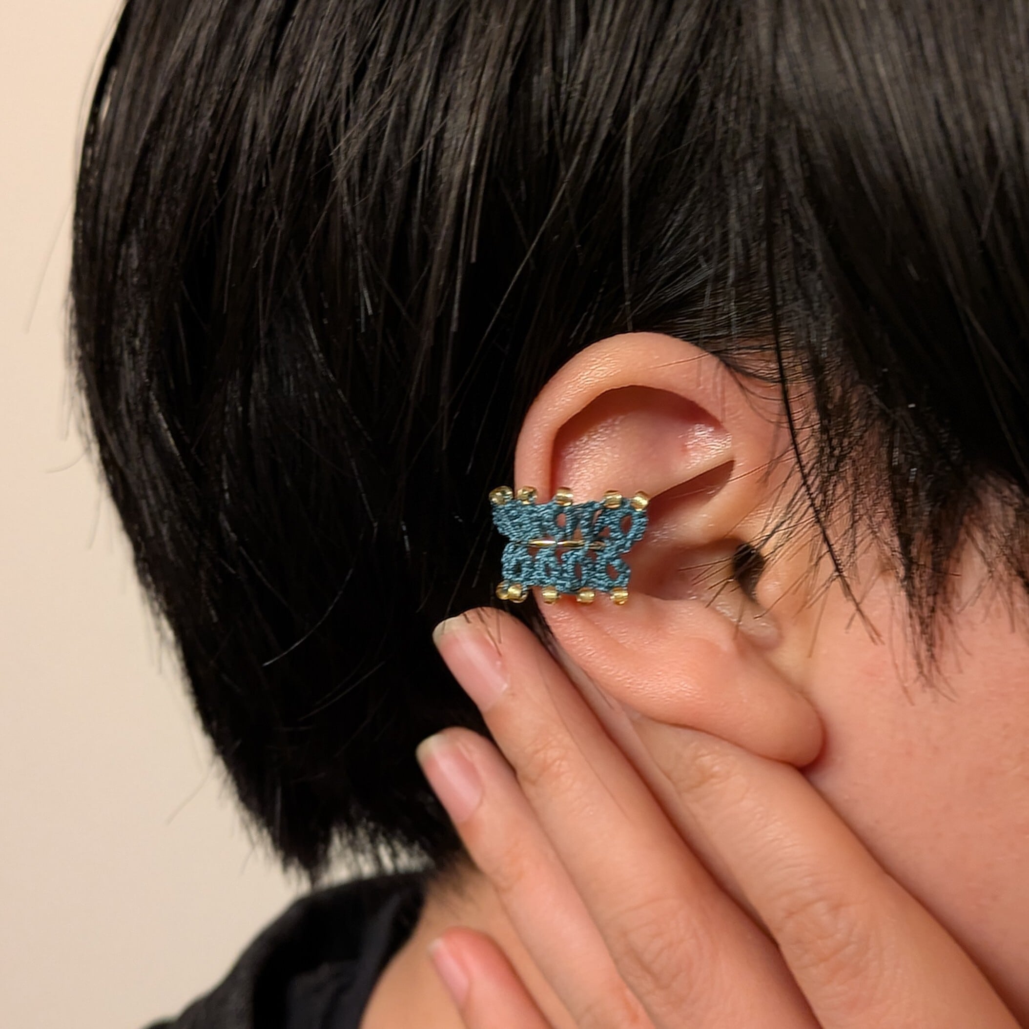 繊細な糸で【輪】を描くように編み上げたタティングレースのイヤーカフ。耳にそっと寄り添い、ぐるりと一周するフォルムが静かな存在感を演出します。