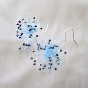 まるで小宇宙のようなこの耳飾りは、細さ約0.33mmのテグスを全て手作業で編み上げた作品です。透明な糸と、角度によって異なる輝きかたをする極小シードビーズをたっぷり使った、特別なアクセサリー。